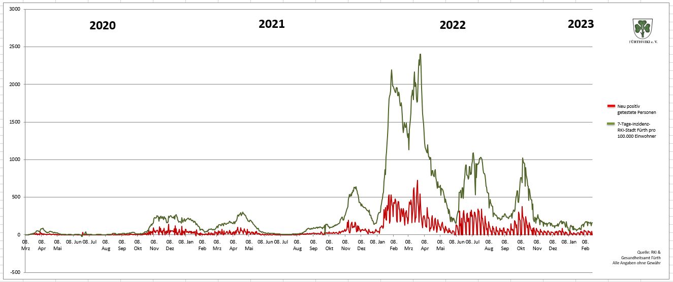 | Dateiinfo (Bild-Unterschrift und Info-Box, automatisch erstellt) | Neu positiv getestete COVID-19-Fälle im Stadtgebiet Fürth mit 7-Tage-Inzidenz – Stand Februar 2023 Urheber: Kamran Salimi<br><br>Lizenz: CC BY-SA 3.0 | ||