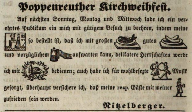 | Dateiinfo (Bild-Unterschrift und Info-Box, automatisch erstellt) | Zeitungsannonce des Wirts Nitzelberger, Einladung zur Poppenreuther Kirchweih, September 1843 Lizenz: NoC-NC 1.0 | ||