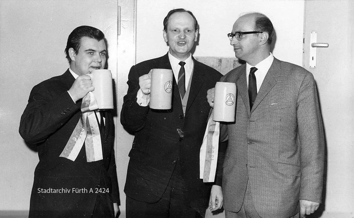 | Beschreibung | Oberbürgermeister Kurt Scherzer beim Poculator-Anstoß mit Geismannsaal-Pächter Rainer Most (links) und Geismann-Brauereidirektor Dr. Ulrich Ost (rechts), 1965 | ||
