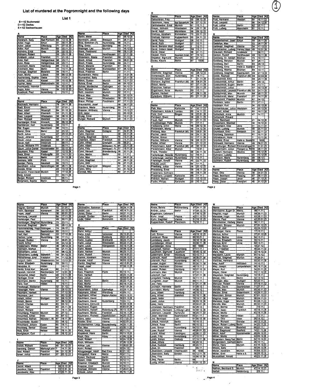 | Beschreibung | alphabetisch geordnete Liste der in der Reichspogromnacht und in Folge derselben getöteten Personen | ||