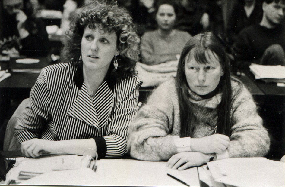 | Beschreibung | Dagmar Orwen und Rotraut Grashey auf einer Grünen Delegiertenversammlung, ca. 1988 | ||