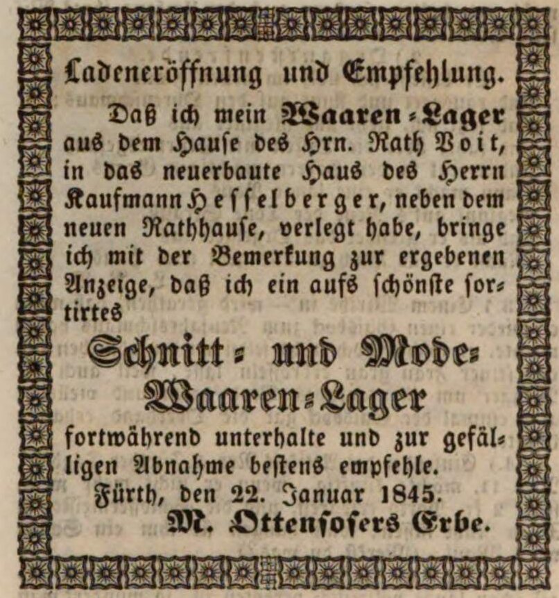 | Dateiinfo (Bild-Unterschrift und Info-Box, automatisch erstellt) | Anzeige Geschäftseröffnung Ottensoser, Fürther Tagblatt 24.1.1845 Urheber: Fürther Tagblatt<br><br>Lizenz: NoC-NC 1.0 | ||