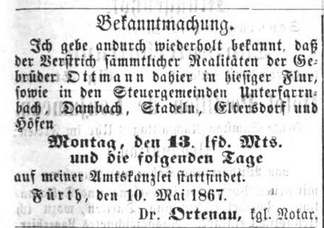 | Beschreibung | Ottmann Konkurs, Fürther Tagblatt, 11.5.1867 | ||