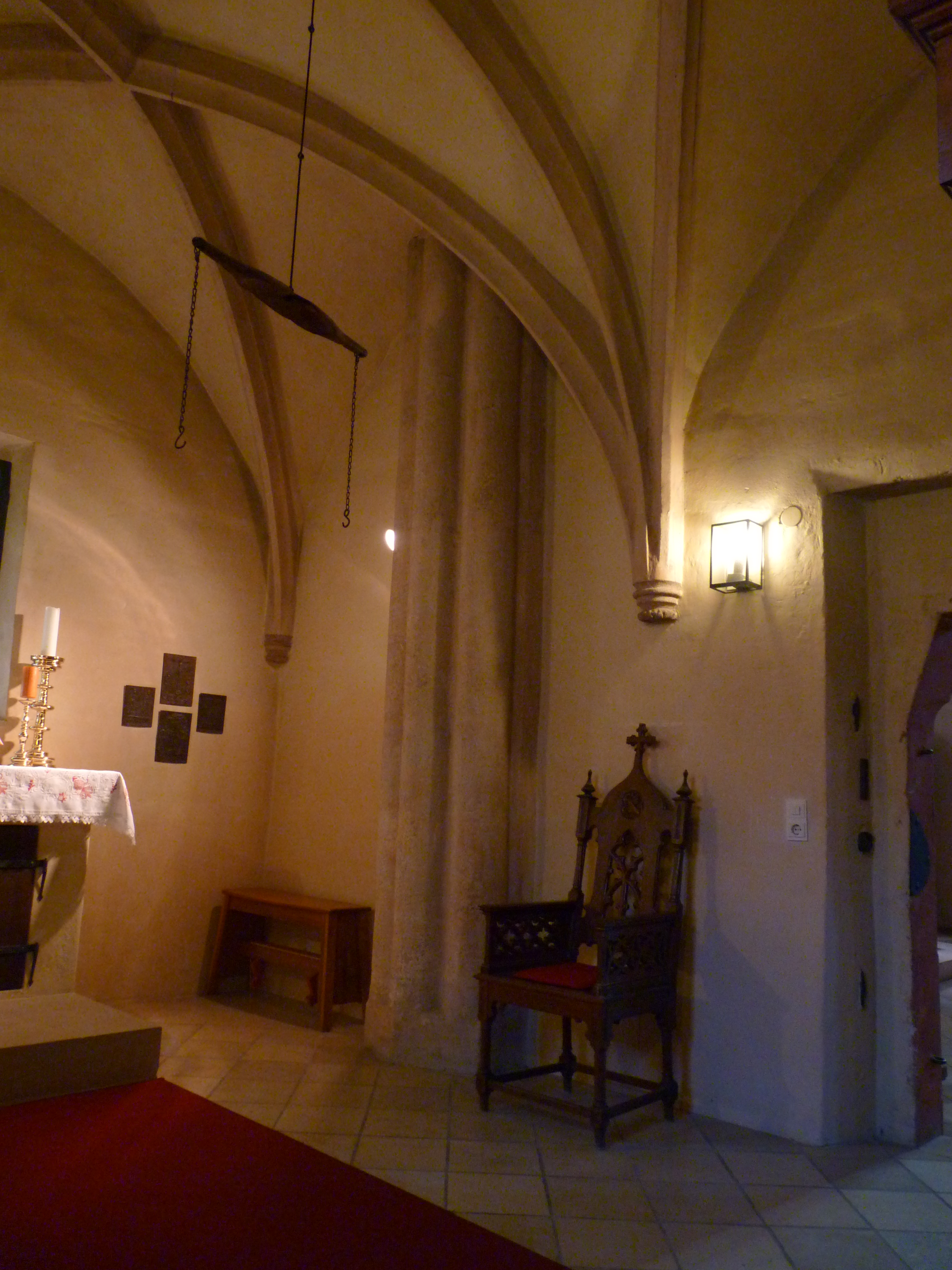 | Dateiinfo (Bild-Unterschrift und Info-Box, automatisch erstellt) | Sakristei mit Säulenstrebe, die vor dem Sakristeianbau an der Kirchenaußenwand stand Urheber: Chrischmi | ||