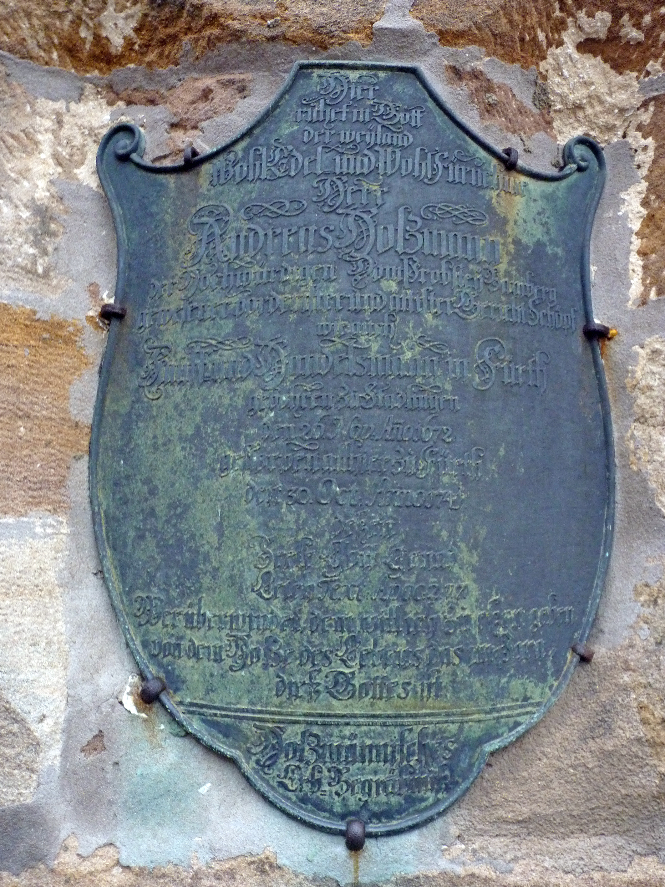 | Beschreibung | Epitaph Andreas Holzmann an der Westseite des Turmes von St. Michael Hier ruht in Gott der weyland Wohl Edel und Wohl Fürnehme | ||