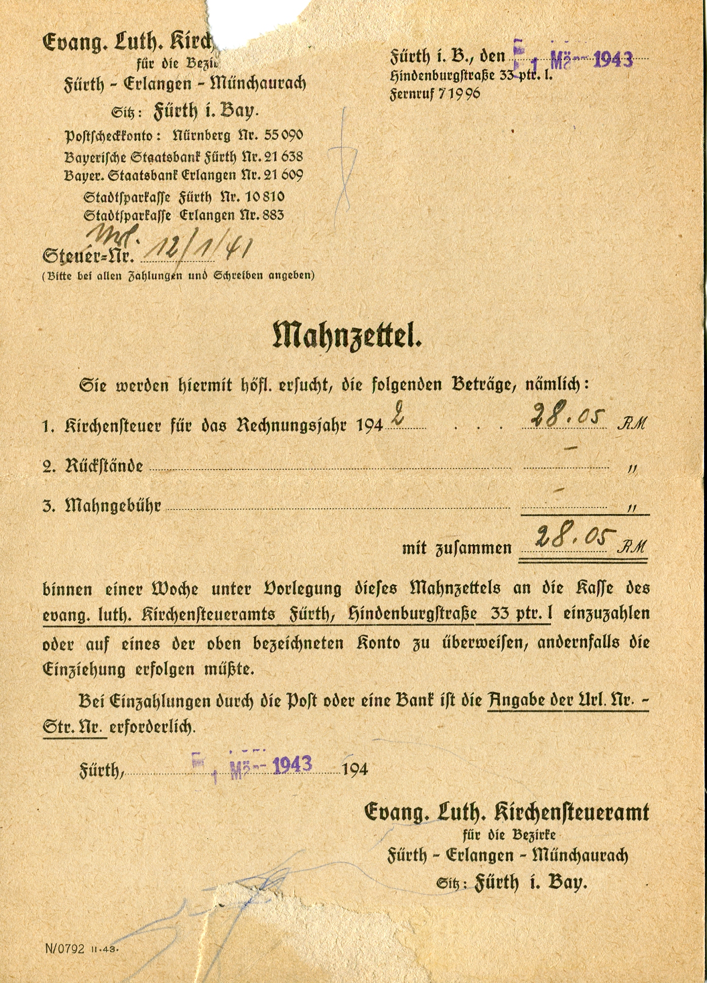 Mahnung Kirchensteuer 1942 - Weltkrieg hin oder her...
