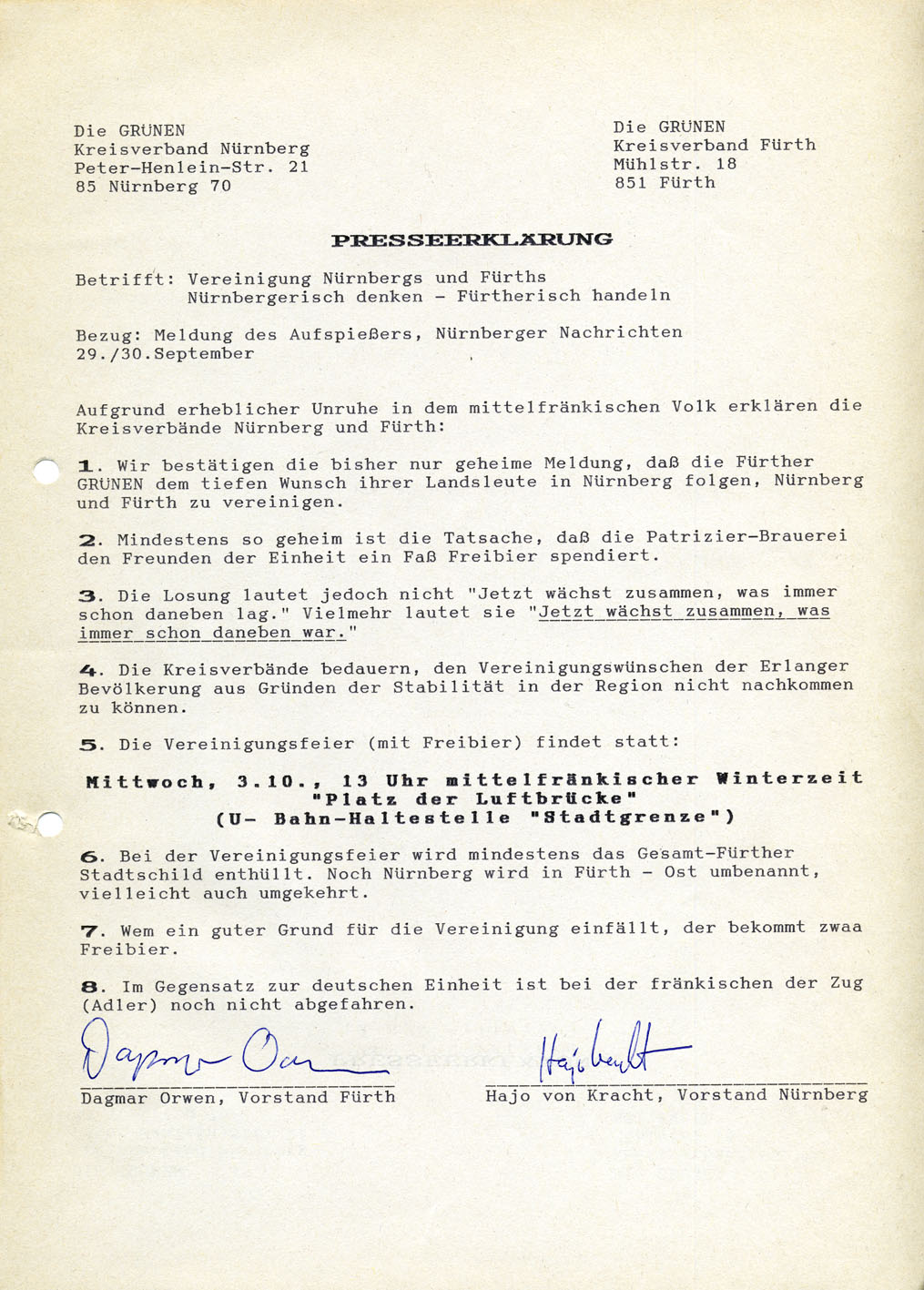 | Beschreibung | Pressemitteilung der Kreisverbände der Grünen zur "Wiedervereinigung der Städte Fürth & Nürnberg" vom 1. Oktober 1990 | ||