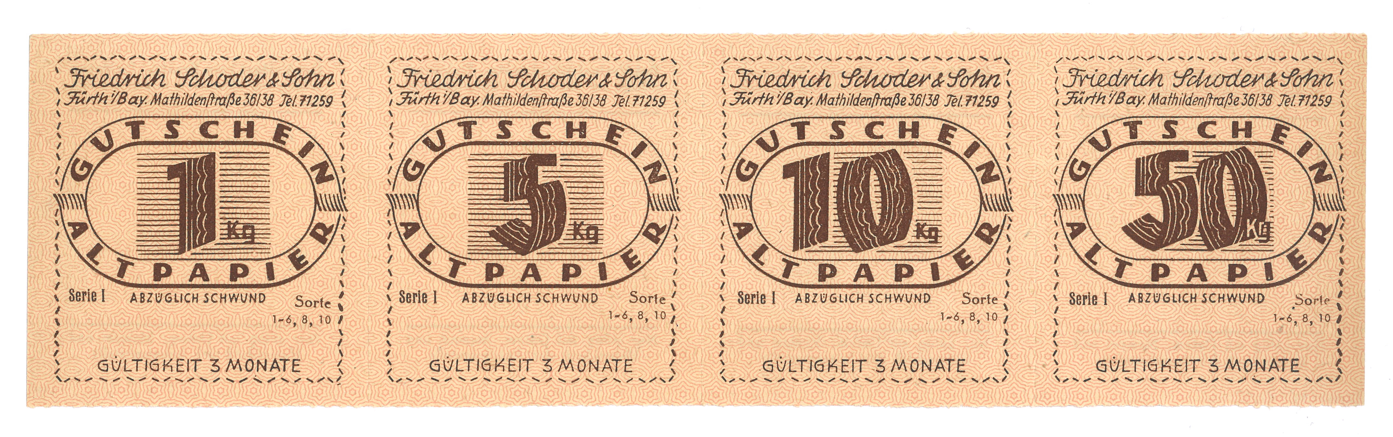 | Beschreibung | Historische Papier-Gutscheine der Fa. Friedrich Schoder & Sohn, ca. 1945 - 49 (rückseitig mit US-Zone beschriftet) | ||