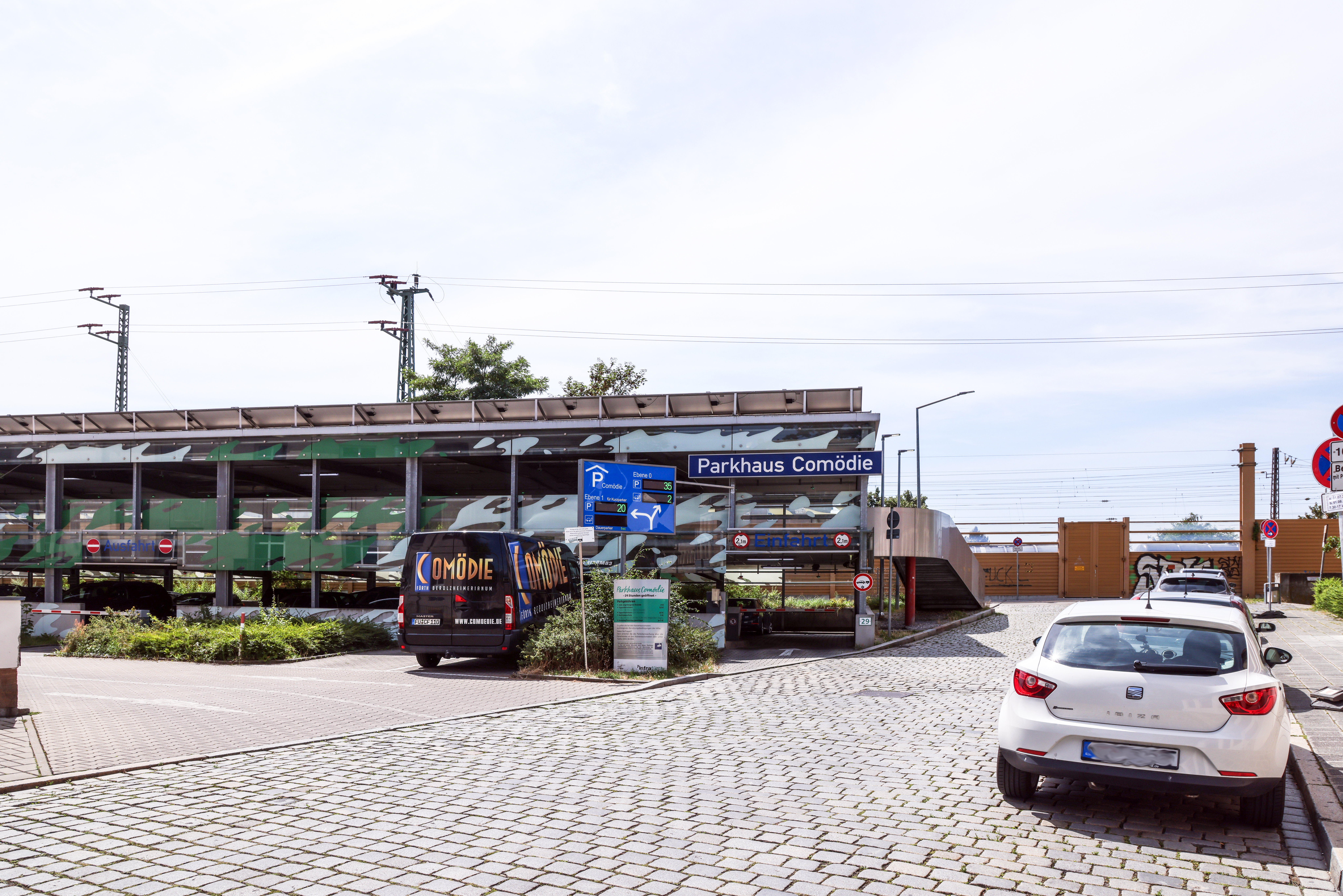 | Beschreibung | Parkhaus Comödie in der Ottostraße, im Hintergrund der ehem. Bahnübergang Ottostraße, Aug. 2024 | ||