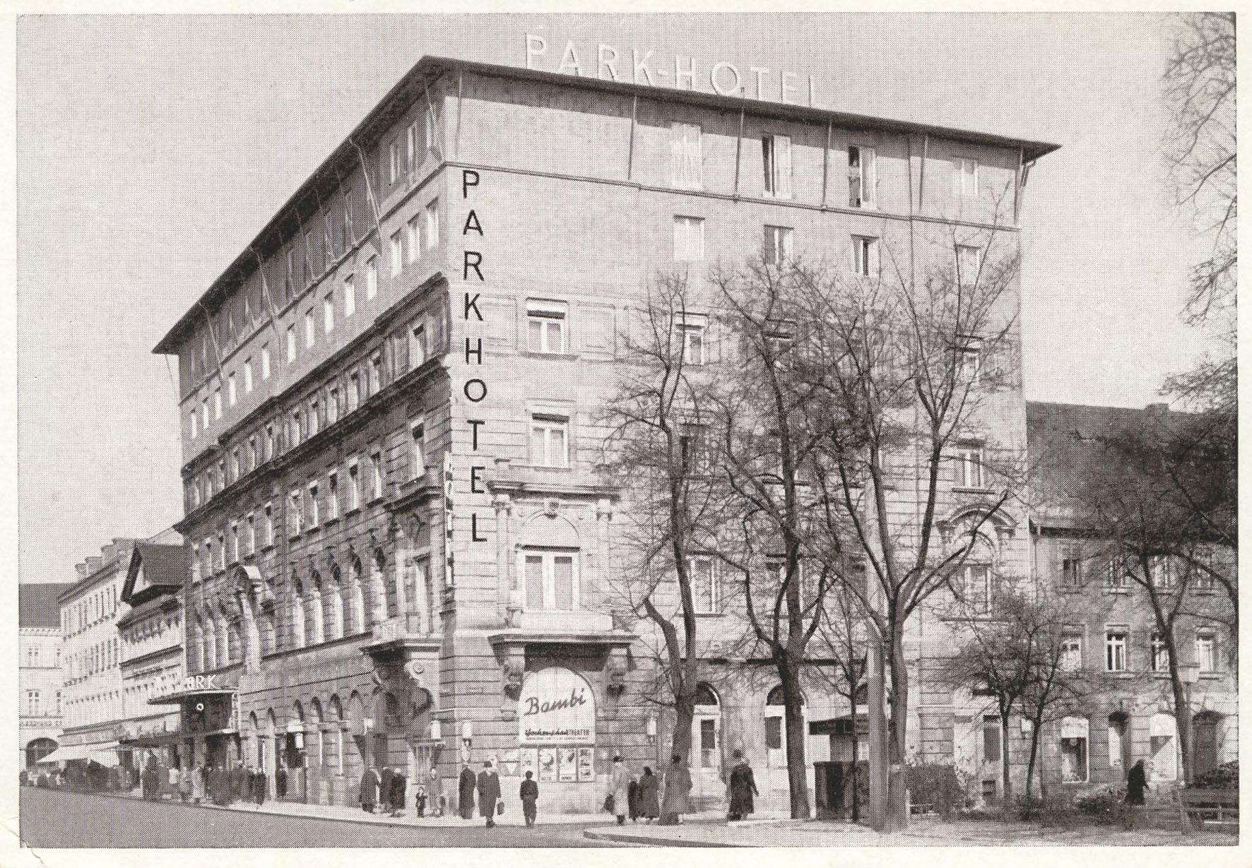 | Dateiinfo (Bild-Unterschrift und Info-Box, automatisch erstellt) | Parkhotel mit Bambi Kino - Blick von der Freiheit zwischen 1953 und 1956 Lizenz: CC BY-SA 3.0 | ||
