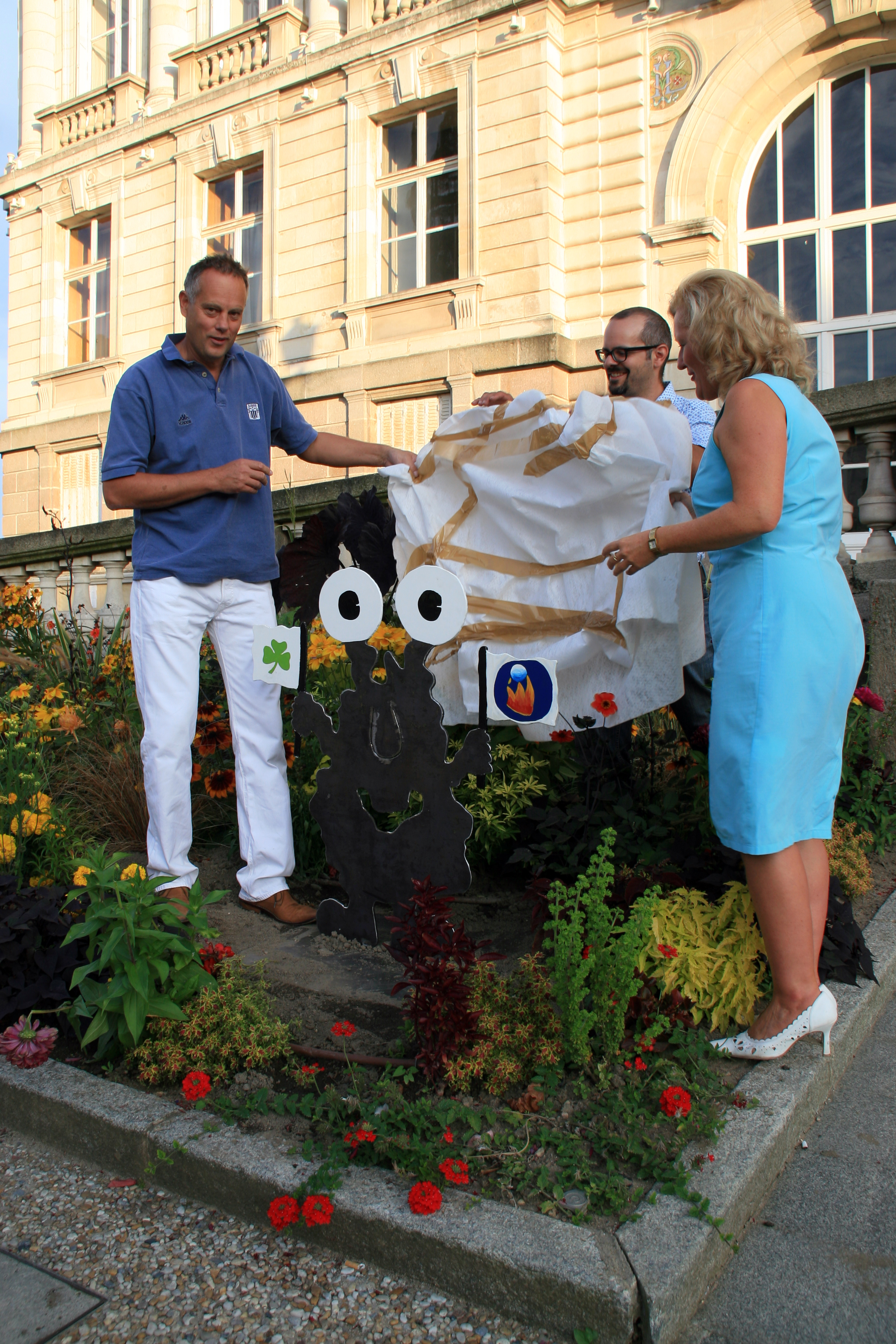 | Beschreibung | Enthüllung des Monster-Kunstwerkes mit den Fahnen der Partnerstädte Limoges und Fürth vor dem Rathaus im Limoges in Frankreich - mit im Bild Stadtrat Martin Forst aus Limoges, Patrick Preller und Hilde Langfeld, Sept. 2010 | ||