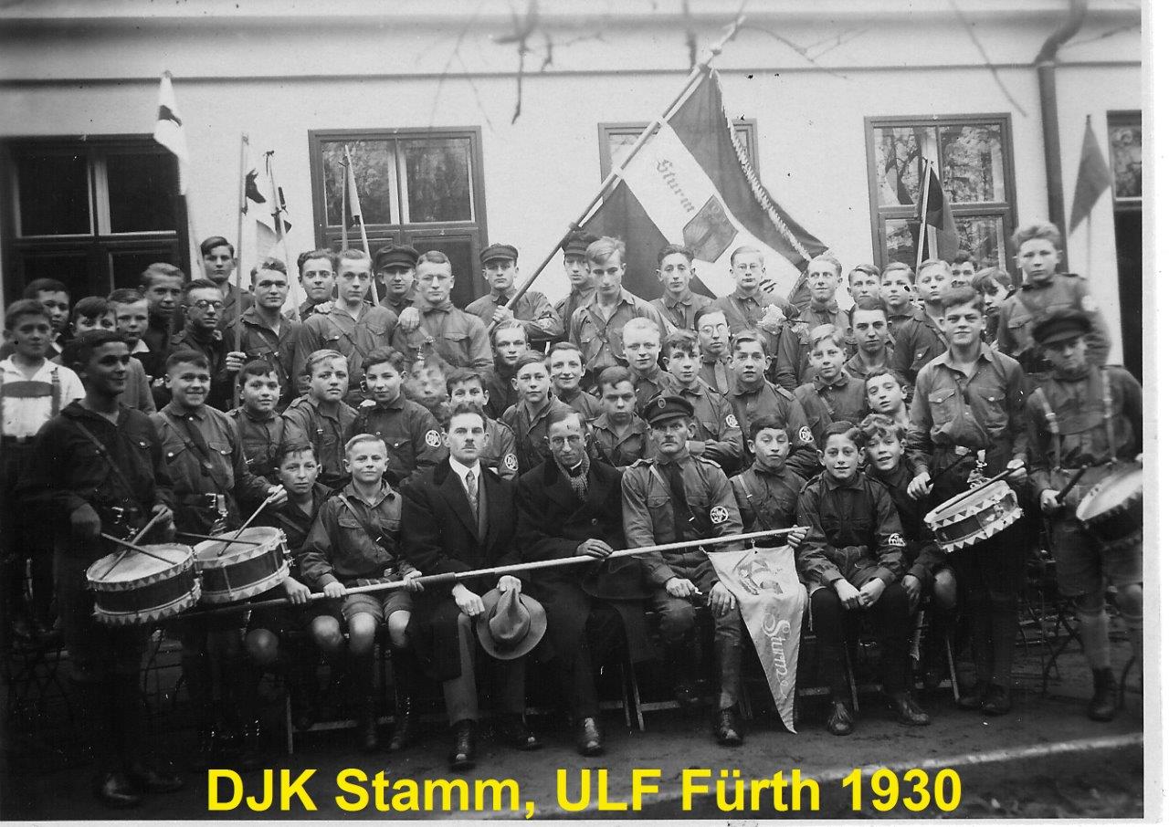 Pfadfinder St. Georg mit der alten Bezeichnung "DJK Stamm ULF Fürth" 1930 vor dem damaligen Jugendheim Königstraße/Karlsteg.