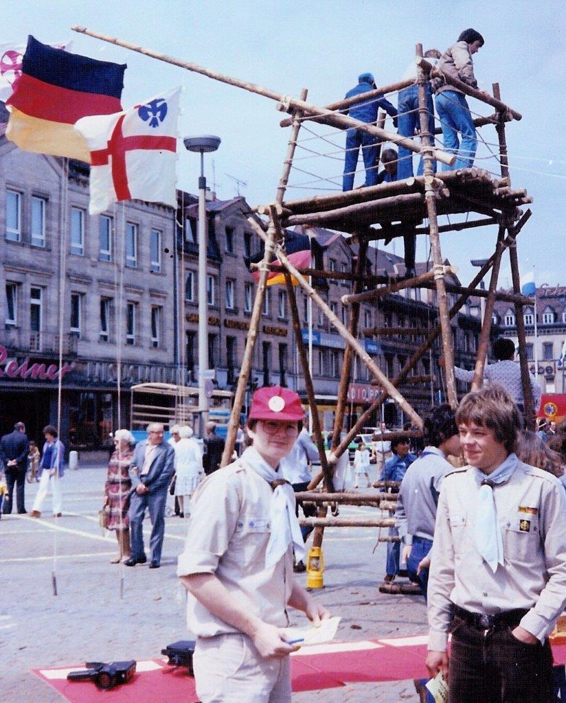 Pfadfinder St. Georg - 1979 Standaufbau mit Zeltlager und Lagerturm Fürther Freiheit zum "Tag des Kindes"