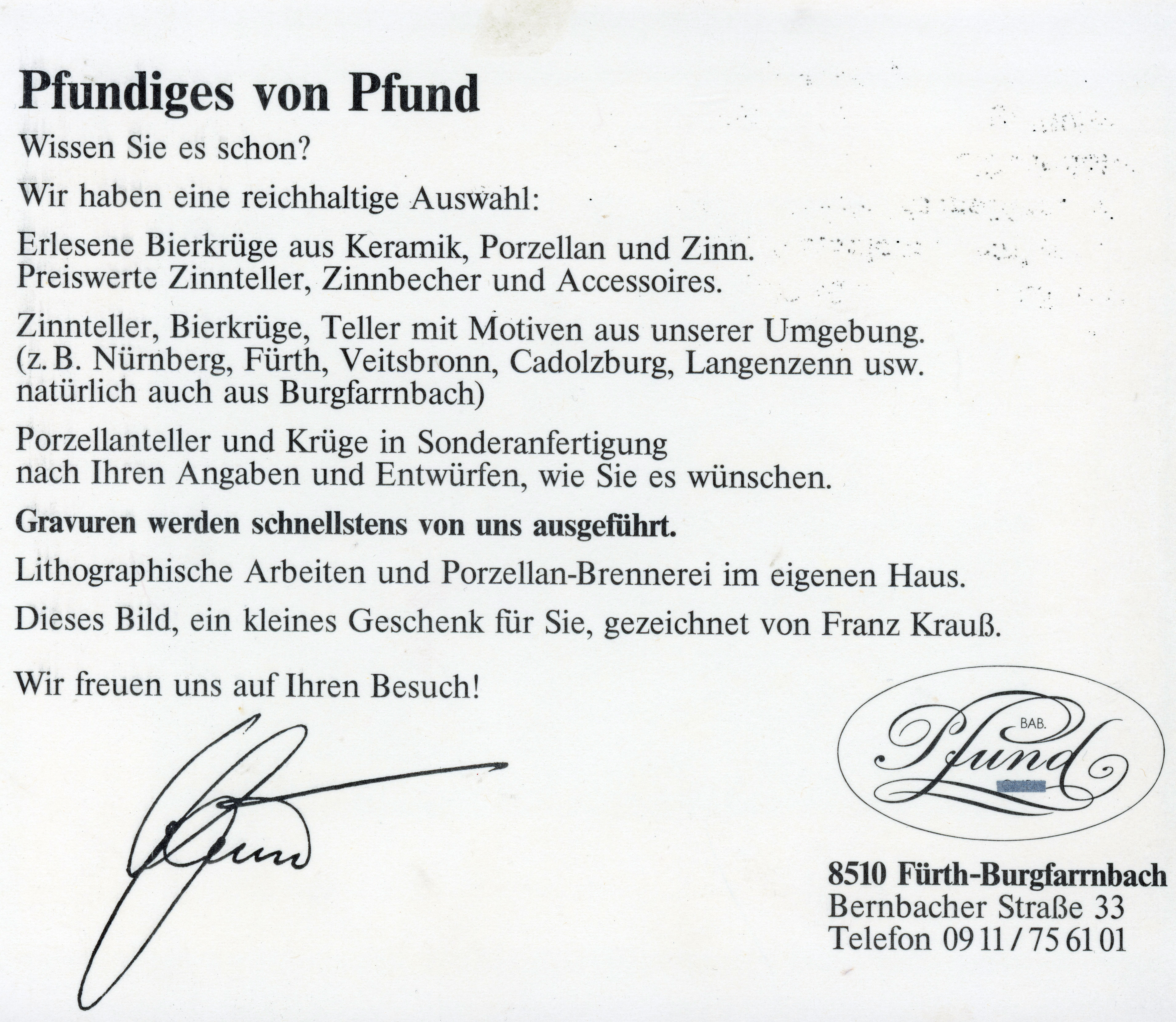| Beschreibung | Geschäftskarte des Burgfarrnbacher Unternehmens Bab. Pfund, ca. 1990 | ||