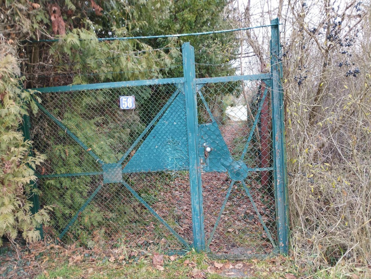 Geschlossenes Tor des Zugangs zur Gartenkolonie "Eigene Scholle" am Brünnleinsweg 58