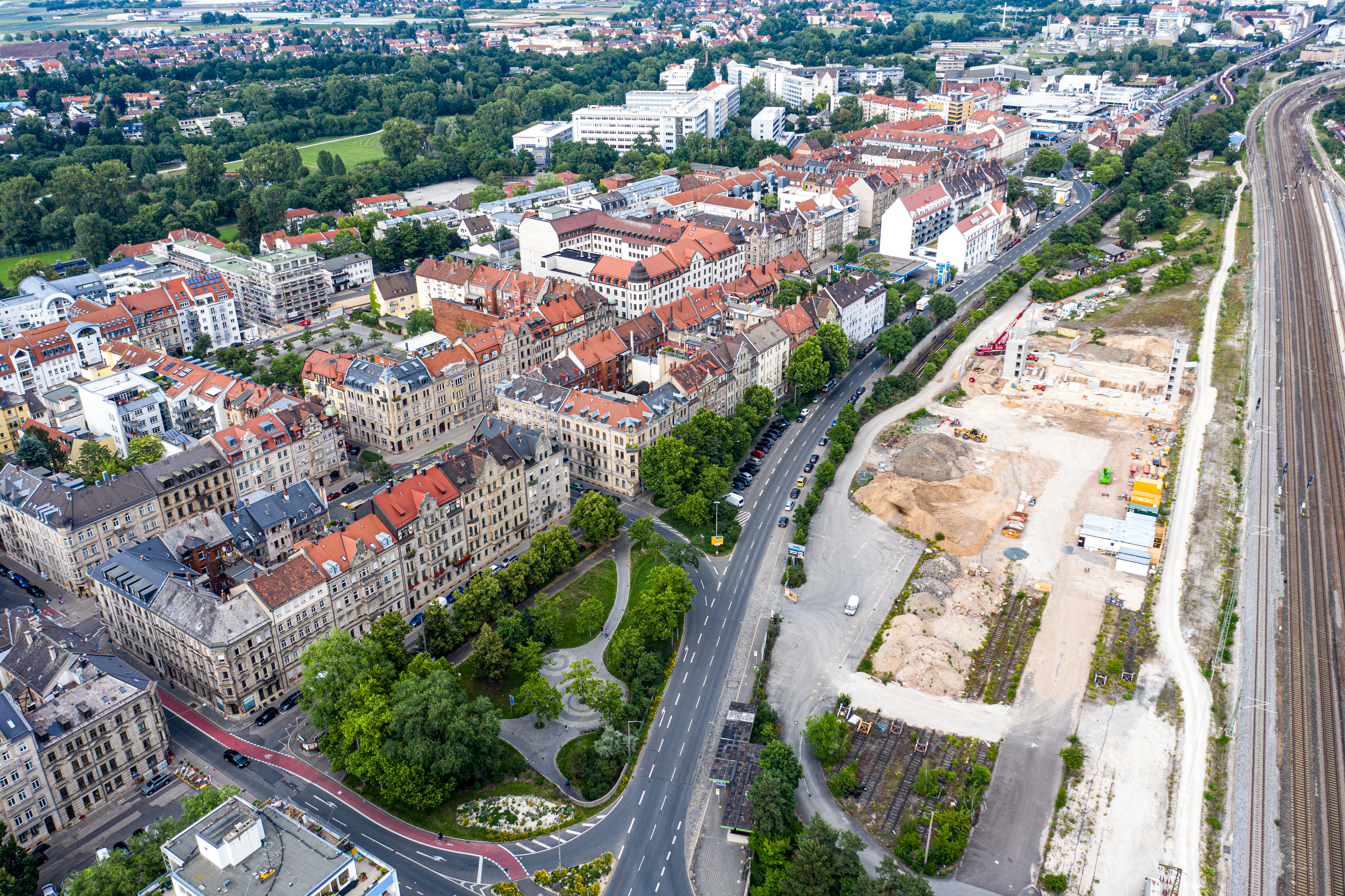 | Beschreibung | Im Vordergrund der Platz der Opfer des Faschismus bzw. U-Bahnhaltestelle Jakobienenstraße, rechts im Bild das Baufeld entlang der Gebhardtstraße, im Hintergrund der historische Lokschuppen, Juni 2020 | ||