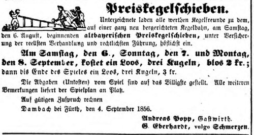 | Beschreibung | Zeitungsannonce des Wirts Andreas Popp in Dambach, September 1856 | ||