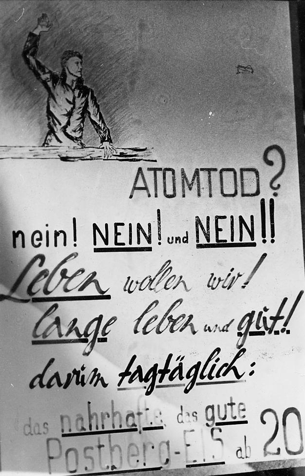 | Beschreibung | Werbung des Postberg-Kiosk gegen den Atomtod - eine politische Parole der Friedensbewegung in den 1950er und 1960er Jahre, u.a. auch beim Ostermarsch, 1958 | ||