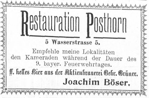 | Quellangaben | Festzeitung für den IX. Bayer. Feuerwehrtag zu Fürth, 18. - 21. August 1900 - online-Digitalisat der Bayerischen Staatsbibliothek | ||