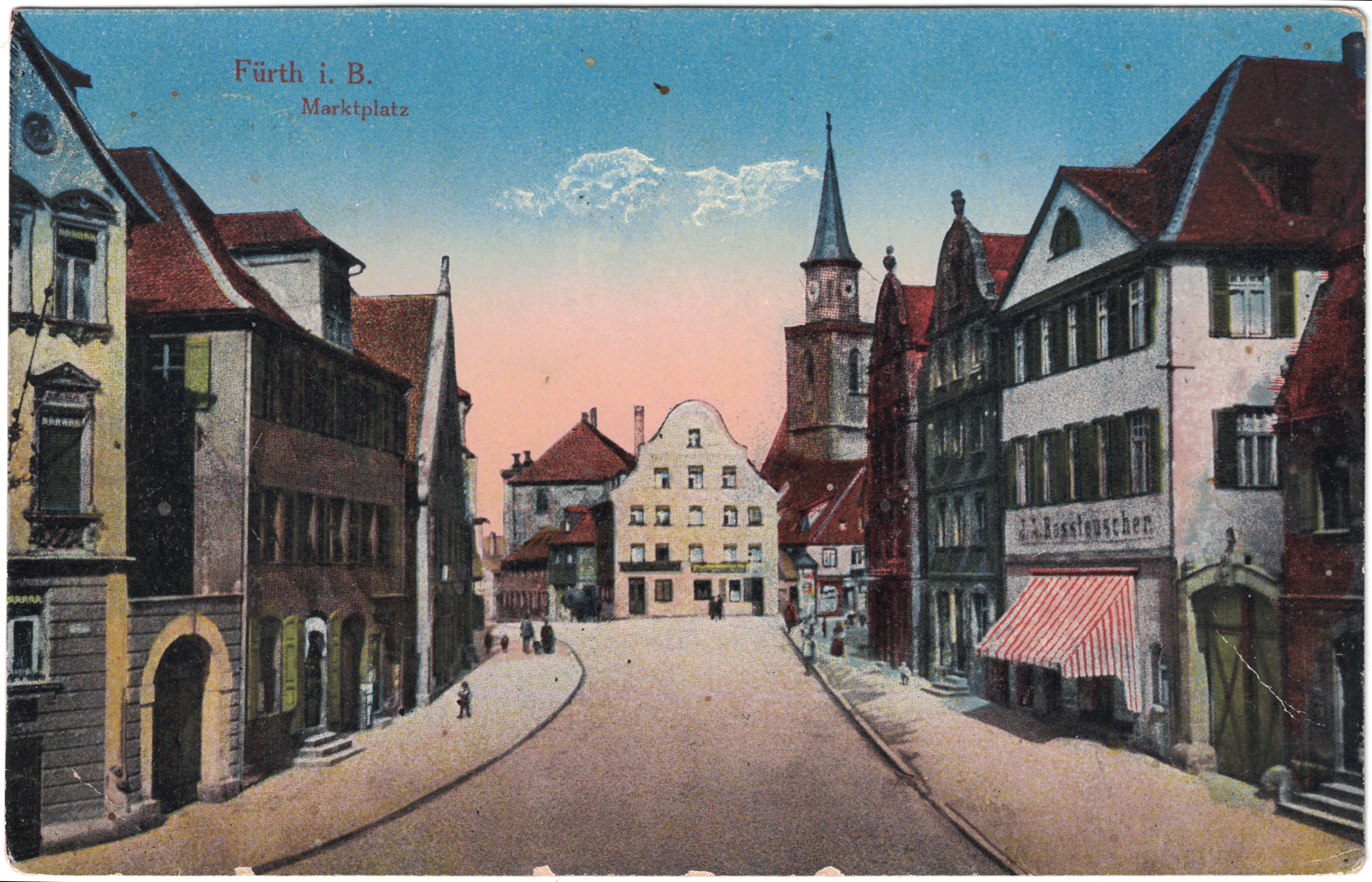 | Dateiinfo (Bild-Unterschrift und Info-Box, automatisch erstellt) | Postkarte "Fürth, Marktplatz", geschrieben und abgestempelt am 18. Juli 1918 (Vorderseite) Lizenz: CC BY-SA 3.0 | ||