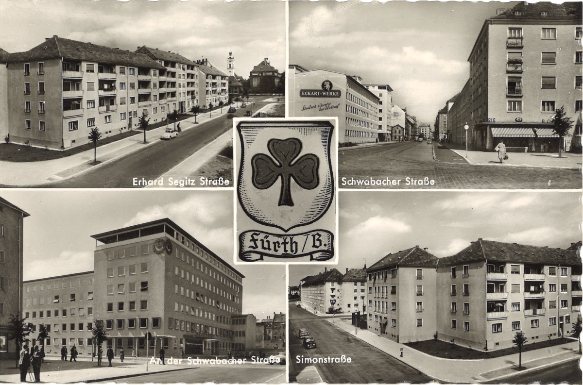 | Beschreibung | Schwabacher Str. mit Eckart-Werken und anderen Neubauten der Zeit. Historische Postkarte, 1954 | ||