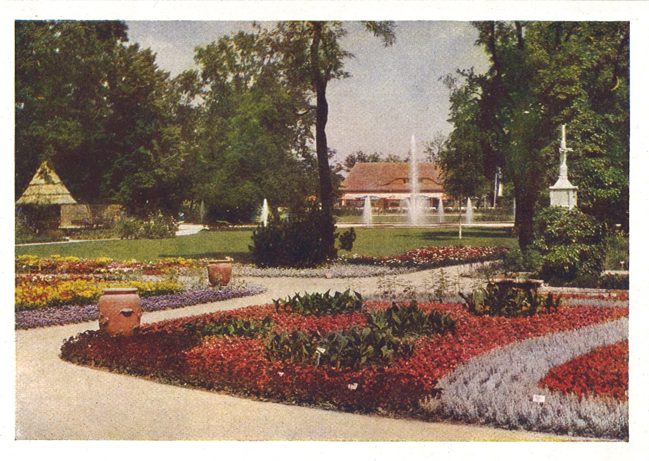 | Beschreibung | Gartenschau 1951, Blick vom Empfangsgarten über die Wasserspiele mit Ausstellungskaffee. Historische Postkarte | ||