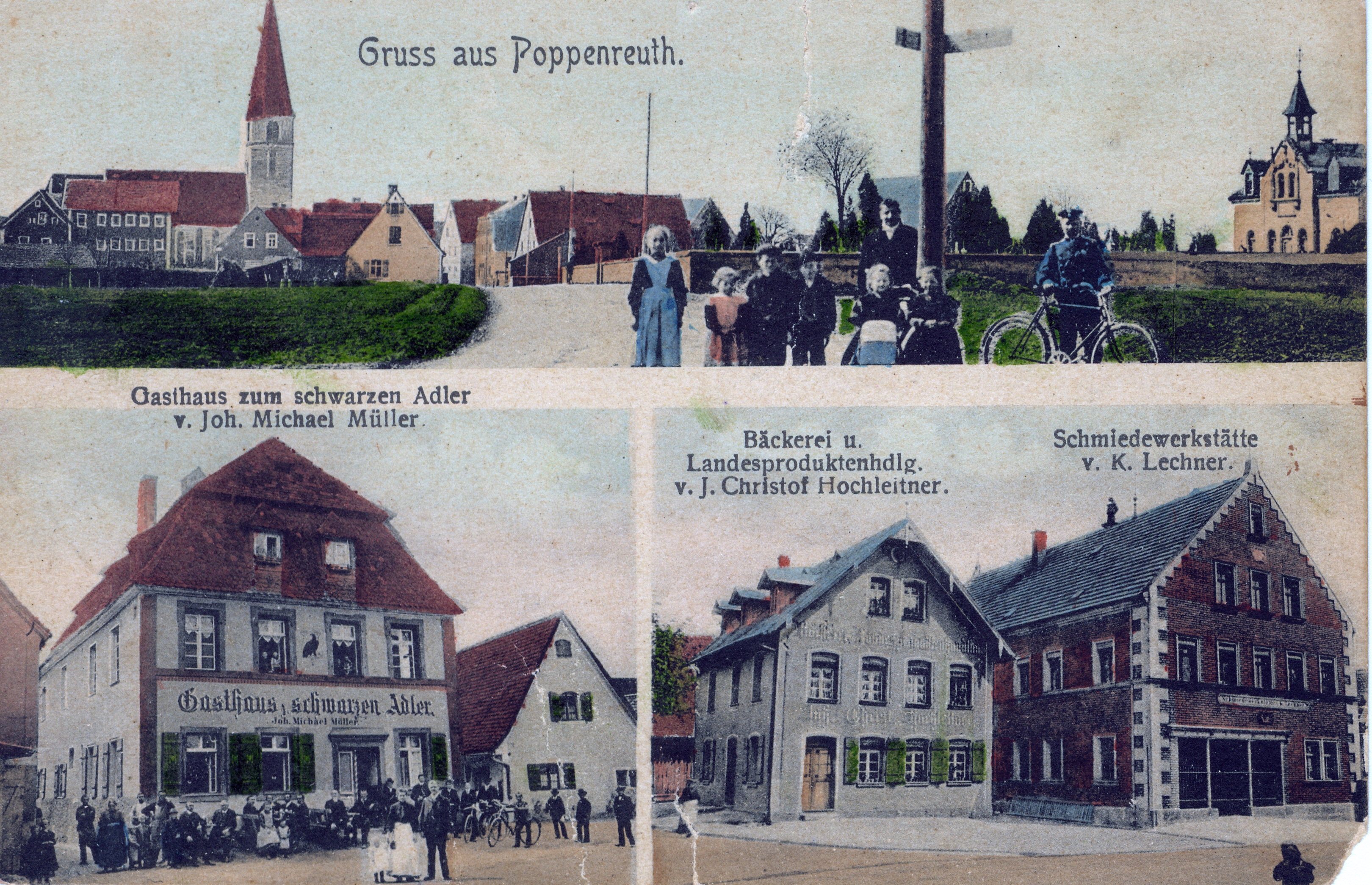 | Beschreibung | Postkarte aus Poppenreuth mit Friedhof, Schwarzem Adler, Bäckerei und Schmiede | ||