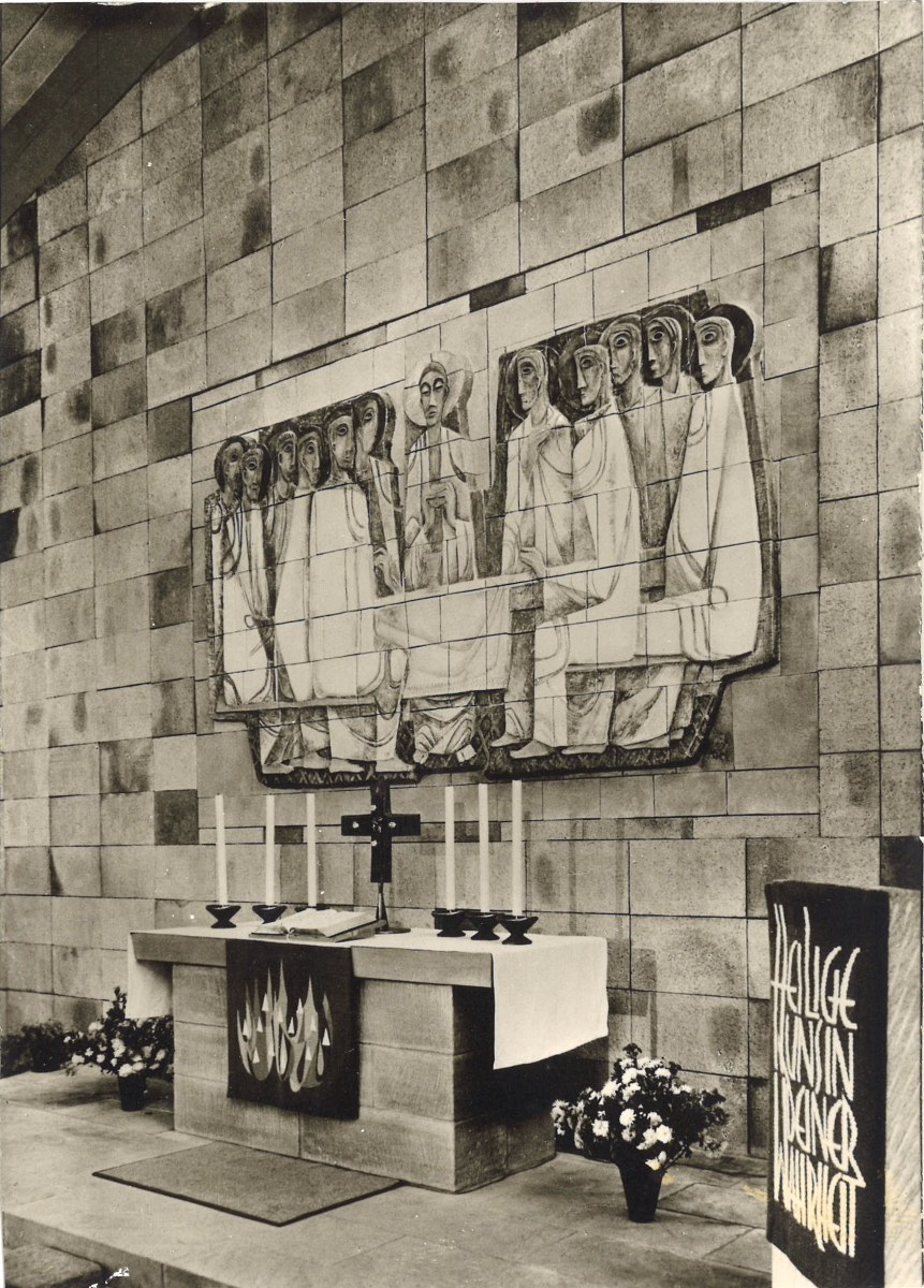 | Beschreibung | Wilhelm-Löhe-Gedächtniskirche, Keramikbild "Abendmahl" über dem Altar. Historische Postkarte, 1977 | ||