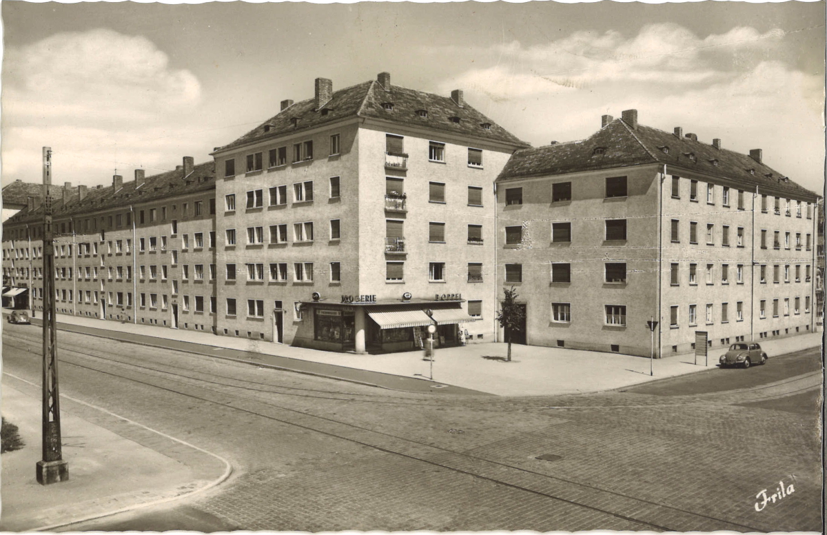 | Beschreibung | Wohnblock der ARGE Fürther Baugenossenschaften, Schwabacher Str., Ecke Flößaustr. Historische Postkarte, 1954 | ||