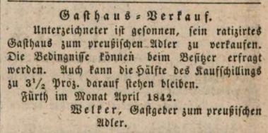 | Beschreibung | Verkaufsanzeige für das Wirtshaus zum preußischen Adler, April 1842 | ||