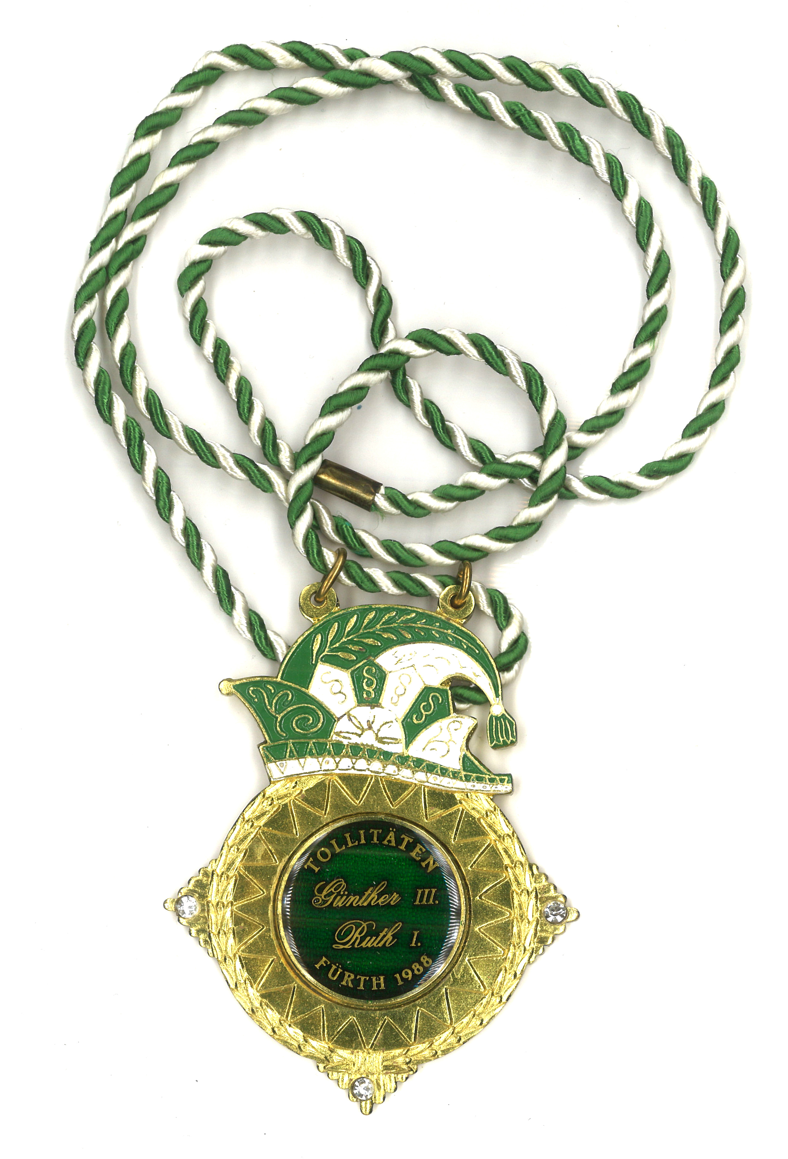 | Dateiinfo (Bild-Unterschrift und Info-Box, automatisch erstellt) | Prinzenpaarorden der CFK, Saison 1988, Metall, „Günther III & Ruth I“ Urheber: Große Carnevalsgesellschaft "Fürther Kleeblatt" 1912 e. V.<br><br>Lizenz: CC BY-SA 3.0 | ||