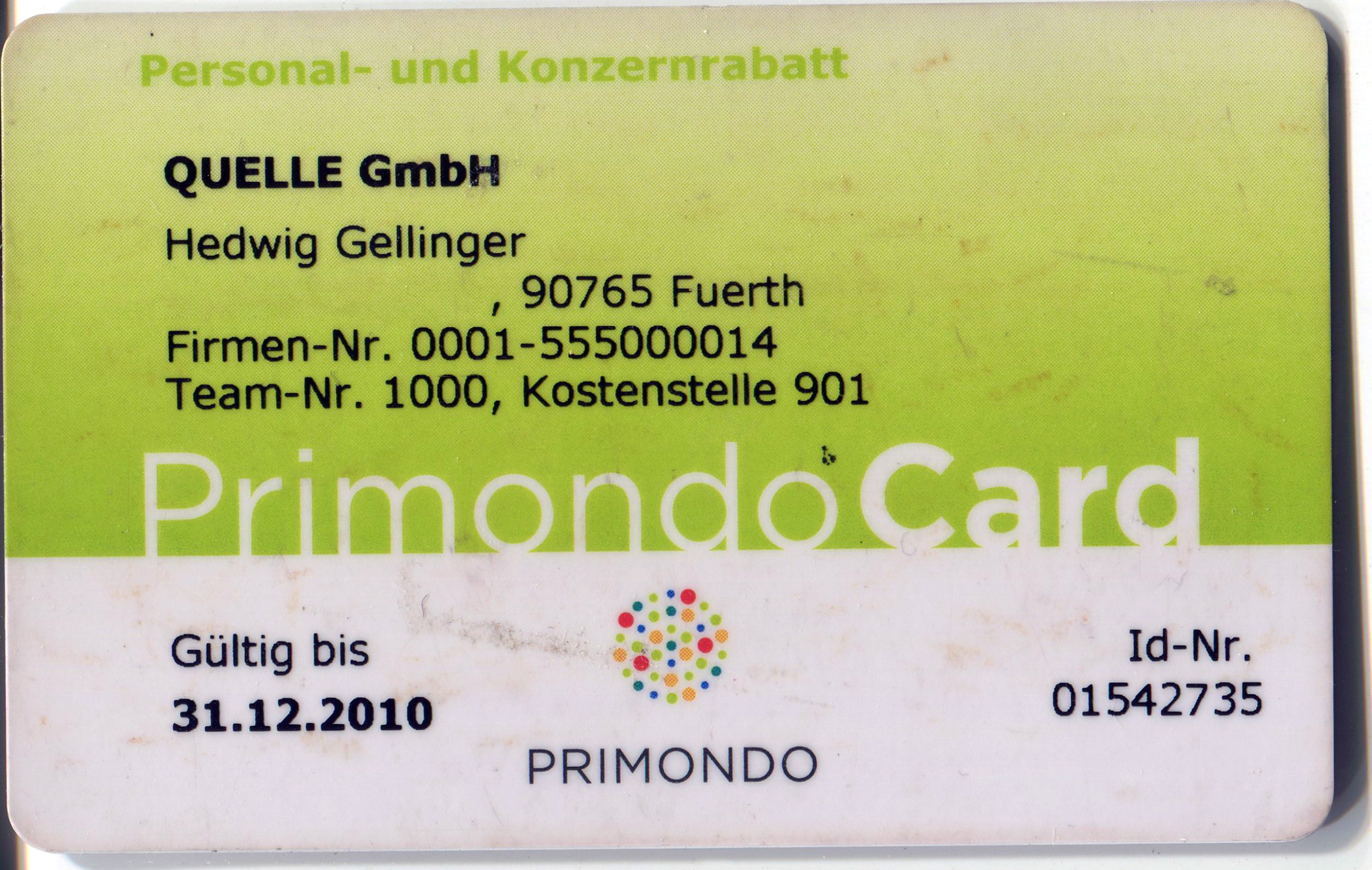 | Beschreibung | Ehem. Mitarbeiterausweis der Fa. Quelle/ Primondo, 2010 | ||