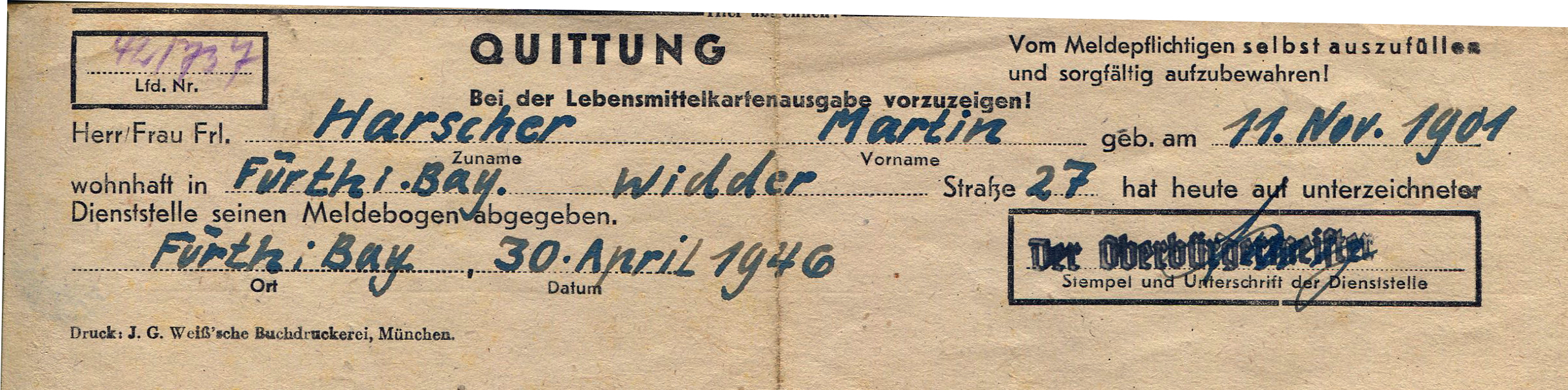 | Beschreibung | Quittung über die Abgabe des Meldebogens zur Entnazifizierung der männlichen Bevölkerung in Fürth gem. dem Gesetz zur Befreiung von Nationalsozialismus und Militarismus in der US-Zone, 1946 | ||