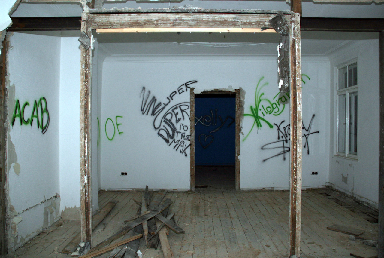 | Dateiinfo (Bild-Unterschrift und Info-Box, automatisch erstellt) | Rudolf-Breitscheid-Straße 4 im 1. OG mit Graffiti-Schmierereien Urheber: unbekannt<br><br>Lizenz: CC BY-SA 3.0 | ||