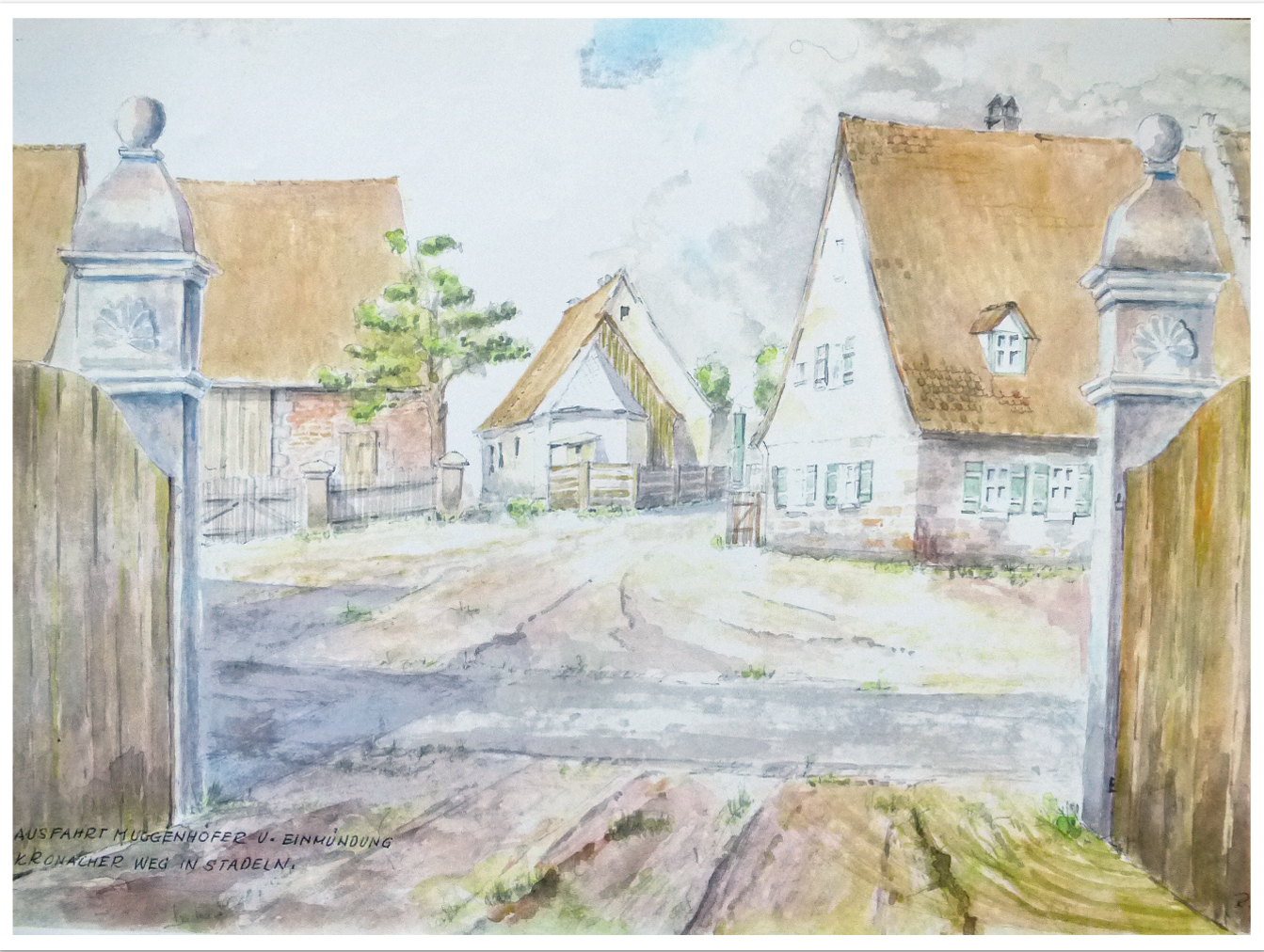 | Beschreibung | Stadelner Hauptstraße, Blick aus dem Muggenhöfer Hof auf die Einmündung des Kronacher Wegs, heute Gebrüder-Grimm-Straße; Gemälde von Rudolf Hofmann | ||