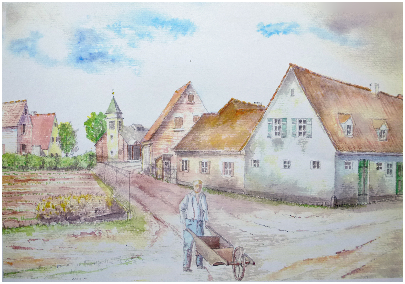| Beschreibung | Der Kirchenweg (heute An der Christuskirche) mit der Christuskapelle in Stadeln von der heutigen Herboldshofer Straße aus gesehen, 1928; Gemälde von Rudolf Hofmann | ||