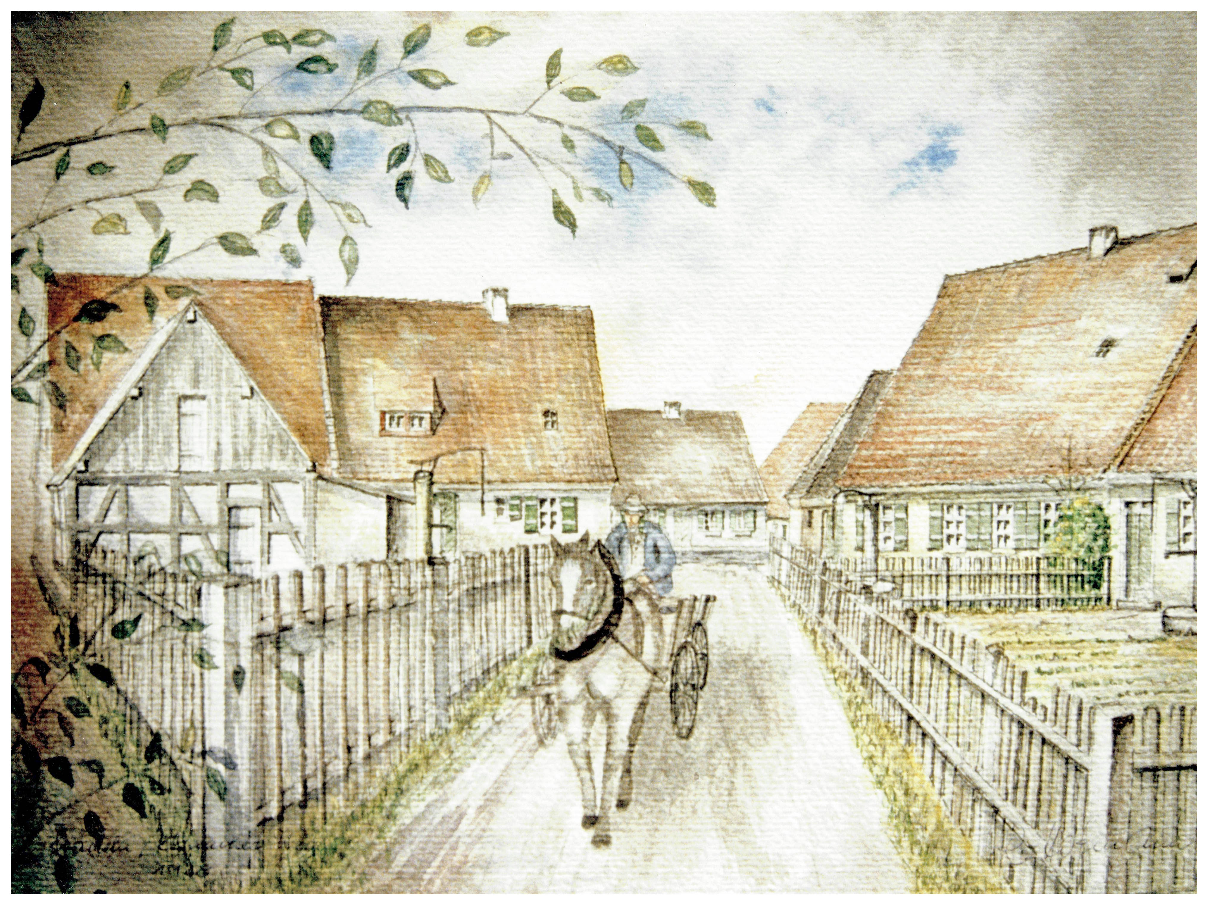 | Beschreibung | Fuhrwerk auf dem Kronacher Weg, heute Gebrüder-Grimm-Straße, in Stadeln, links der Dreiecksgarten vom Bauernhaus heute Stadelner Hauptstraße 76, rechts das ehem. Gebäude Gebrüder-Grimm-Straße 1, 1928; Gemälde von Rudolf Hofmann | ||