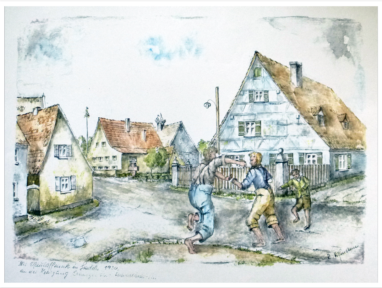 | Beschreibung | Das ehemalige Maulaffeneck in Stadeln; es befand sich an der Kreuzung der Erlanger Straße, heute Stadelner Hauptstraße 89, mit der Herboldshofer Straße; links die ersten Häuser Herboldshofer Straße, Mitte Gästehaus Kalb mit Kriegerdenkmal und Storchenhaus, rechts Gebäude Stadelner Hauptstraße 89, Gemälde von Rudolf Hofmann | ||