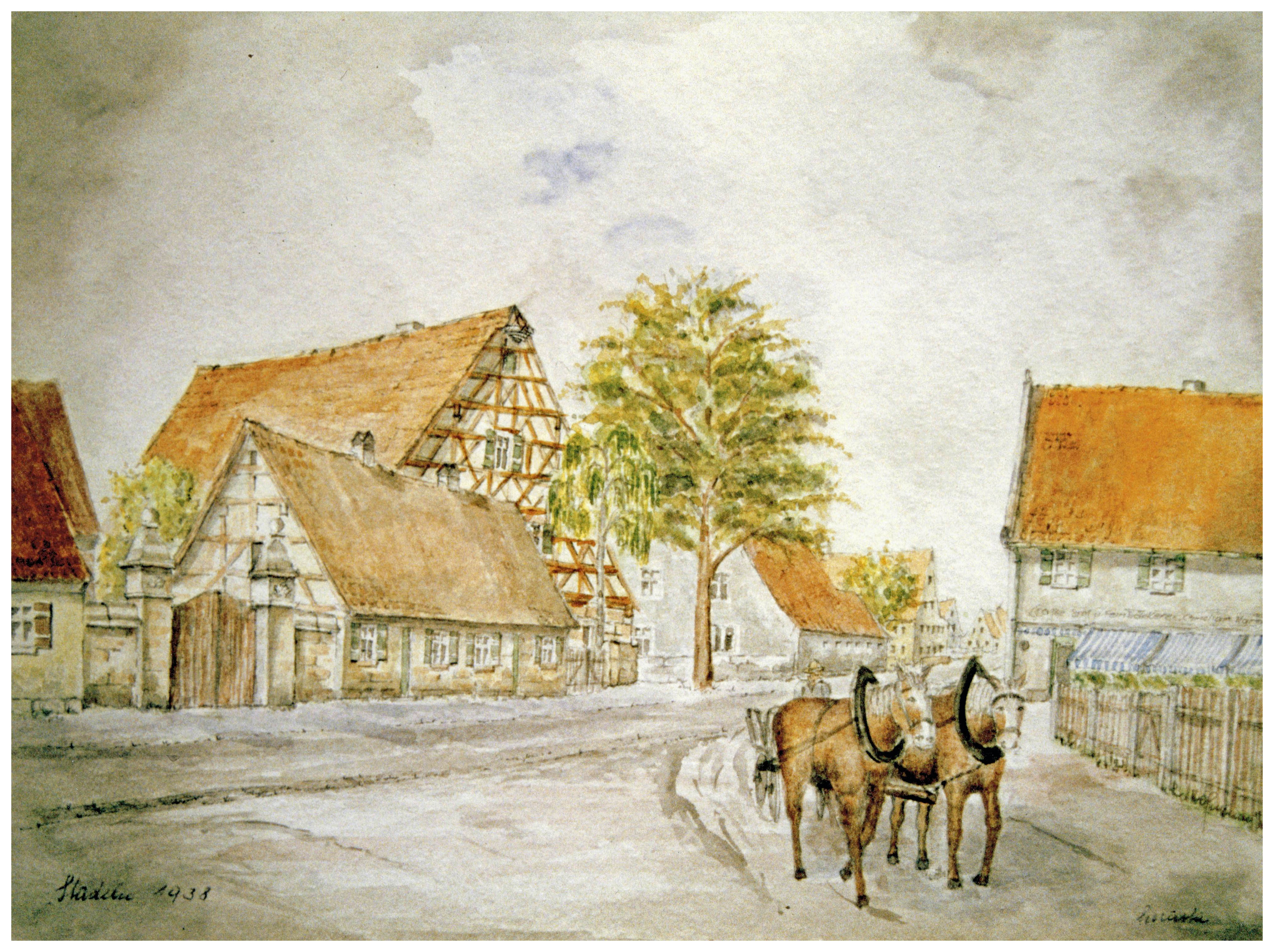 | Beschreibung | Bauernhof und Muggenhöferhaus in Stadeln, Pferdegespann auf den Weg in die heutige Gebrüder-Grimm-Straße, 1938; Gemälde von Rudolf Hofmann | ||
