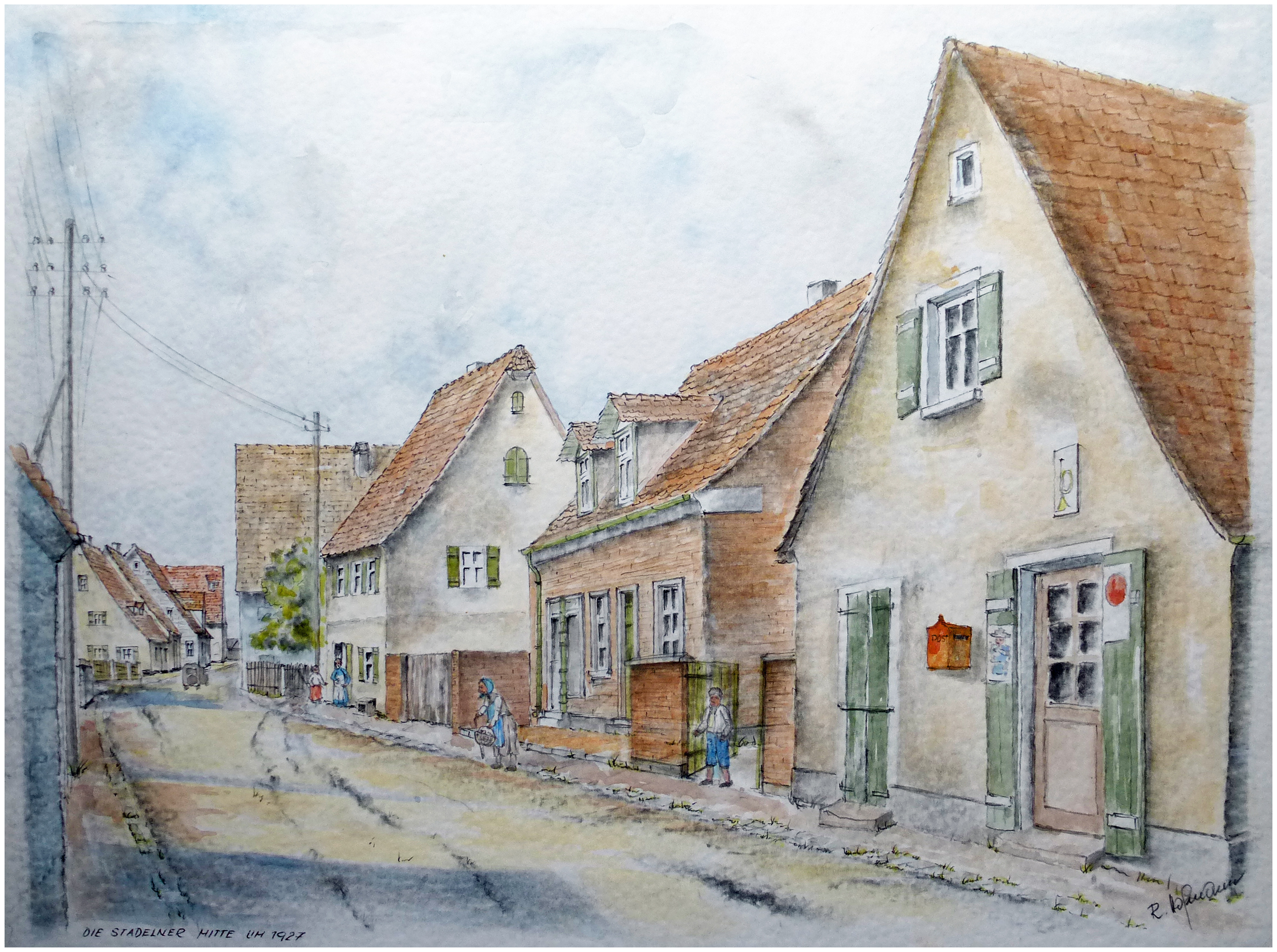 | Beschreibung | Die Ortsmitte in Stadeln um 1927; re. Straßenseite v.l.n.r.: Wirtshaus Ulrich-Ramsteck, Spezereihandlung Bäuerlein mit Poststelle und Bürgermeisteramt, Spezereihandlung Käthe Müller, Metzgerei Amm. Li. Straßenseite: im Vordergrund ein Teil des Stallgebäudes Romming, Schmiede Ströbel, Bauernhof Grau-Ulrich, Gasthaus 'Goldener Engel'; Gemälde von Rudolf Hofmann | ||