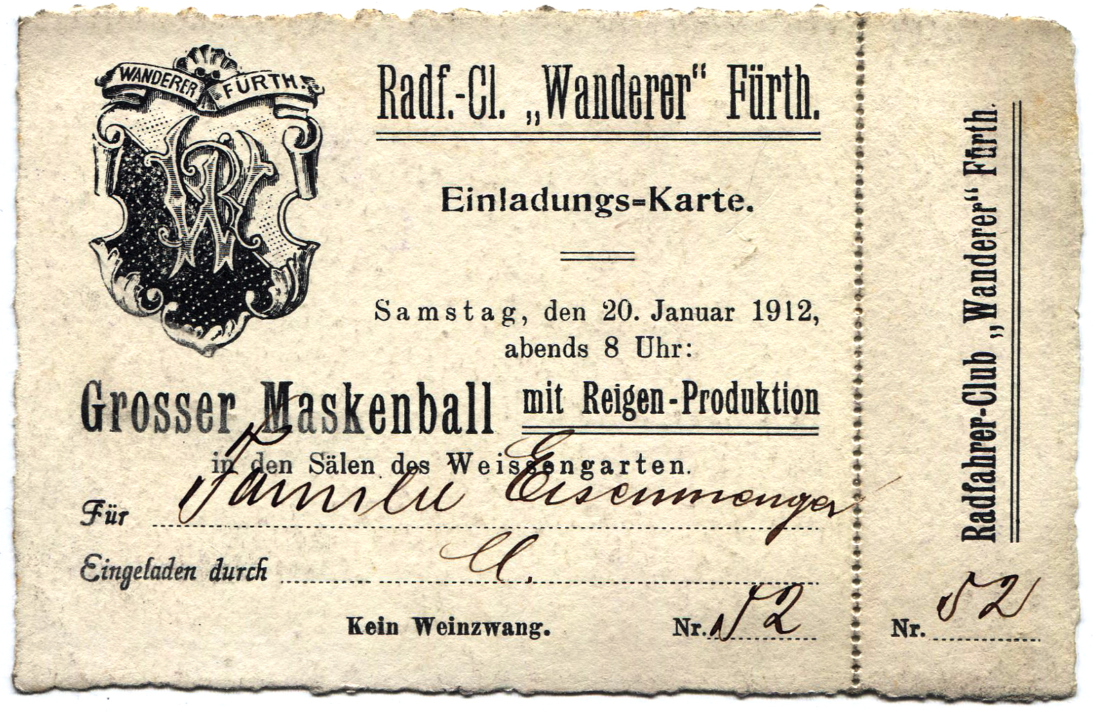 | Beschreibung | Einladungskarte zum Großen Maskenball im großen Sall der ehem. Gaststätte Weißengarten durch den Radfahrer-Club Wanderer, 1912 | ||