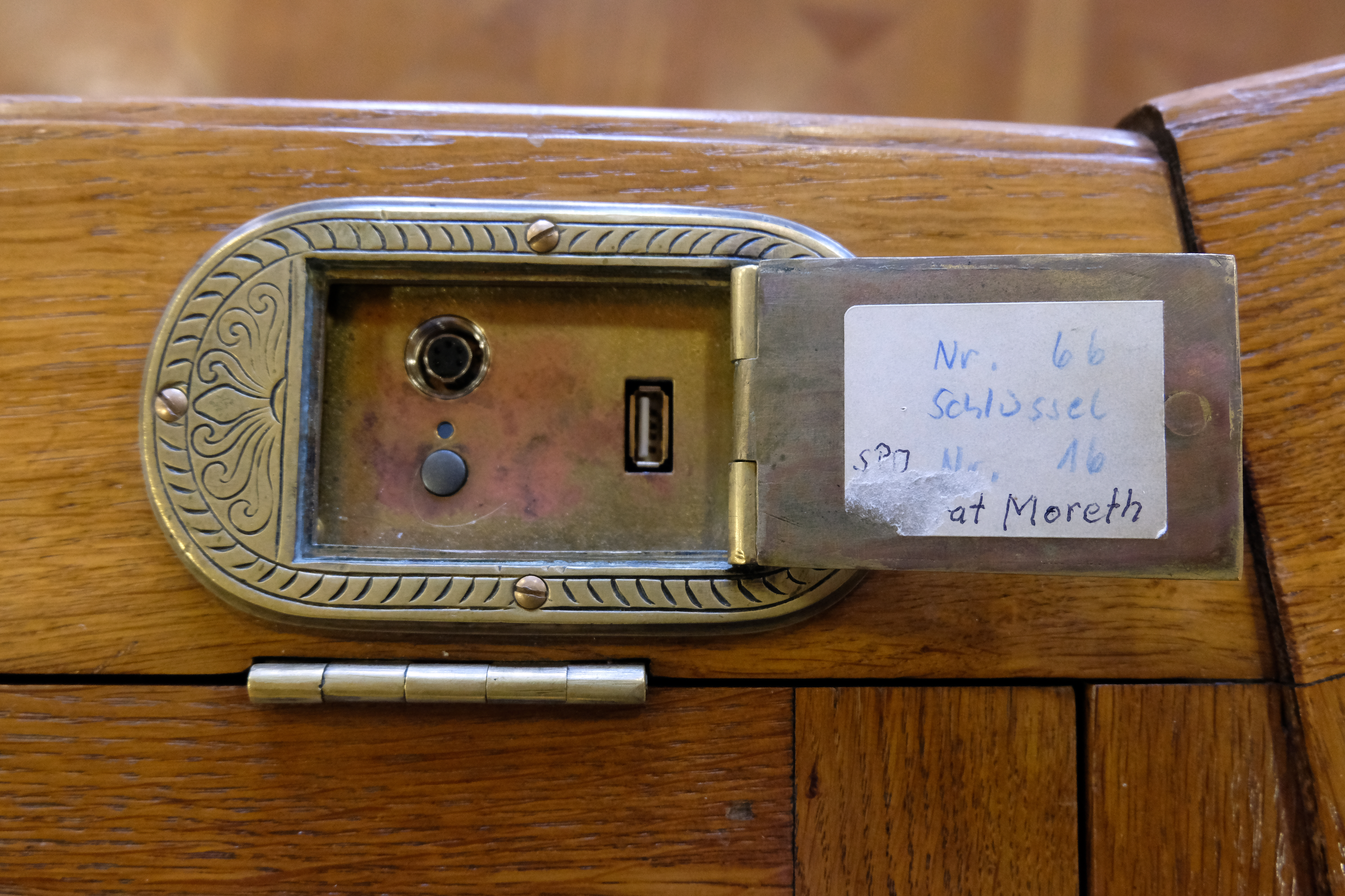 | Beschreibung | Ehem. Platzhalter für das Tintenfass im Arbeitspult im Sitzungsaal im 2. OG im Rathaus - heute USB-Ladestelle und Anschluss für die Mikrofonanlage, Nov. 2020 | ||