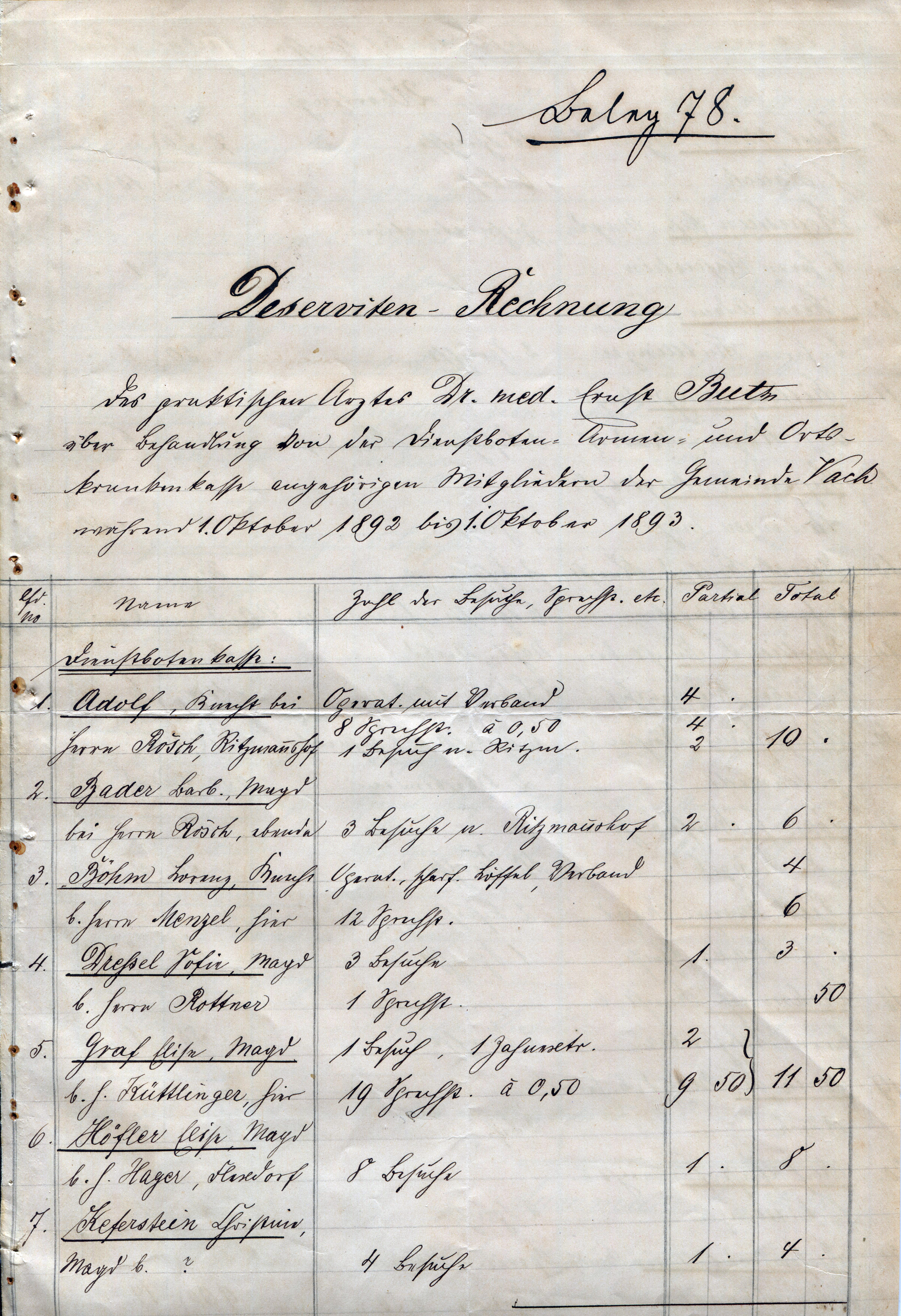 | Beschreibung | Rechnung von Dr. Butz über die Behandlung von Patienten aus Vach über die Armen- und Ortskrankenkasse, 1. Oktober 1892 bis 1. Oktober 1893 | ||