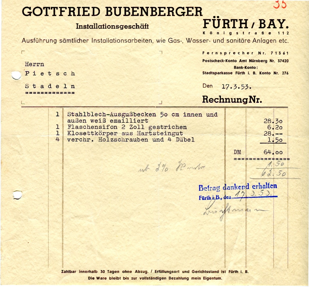 | Beschreibung | Rechnung der Firma Gottfried Bubenberger vom 17.03.1953 | ||