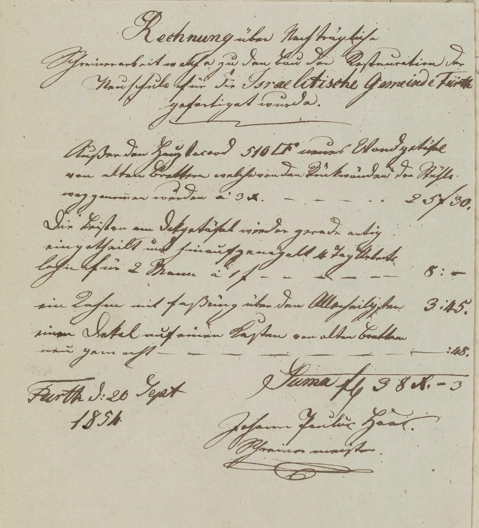 | Beschreibung | Rechnungsstellung für Arbeiten an der Neuschul, Johann Paul Haas, 20. September 1851 | ||
