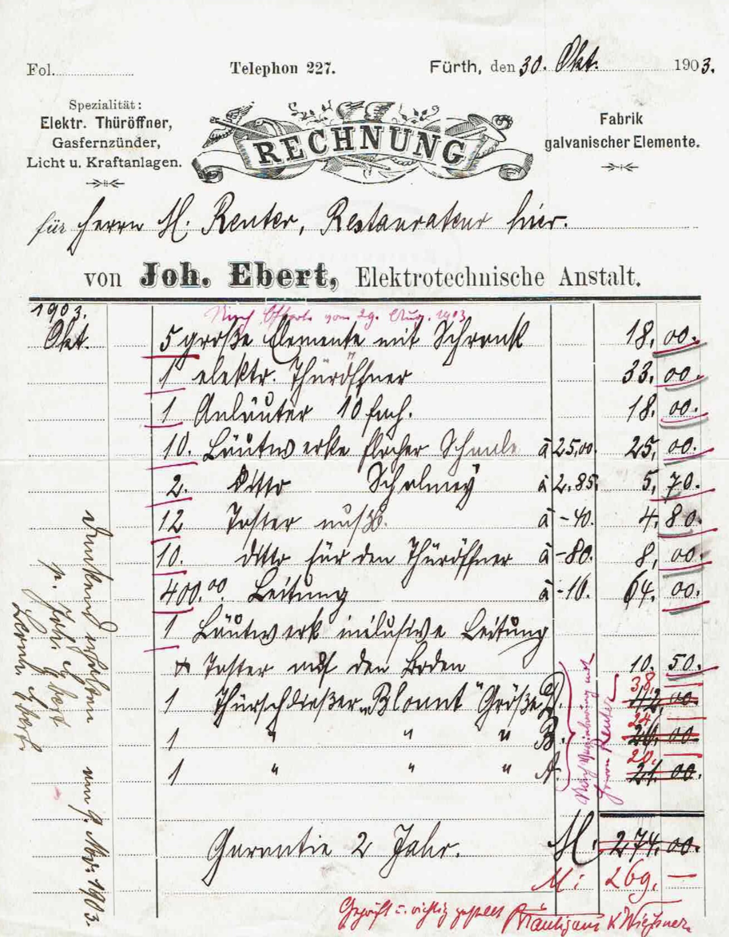 | Beschreibung | Rechnung der Elektrotechnischen Anstalt Joh. Ebert vom 30. Oktober 1903 | ||