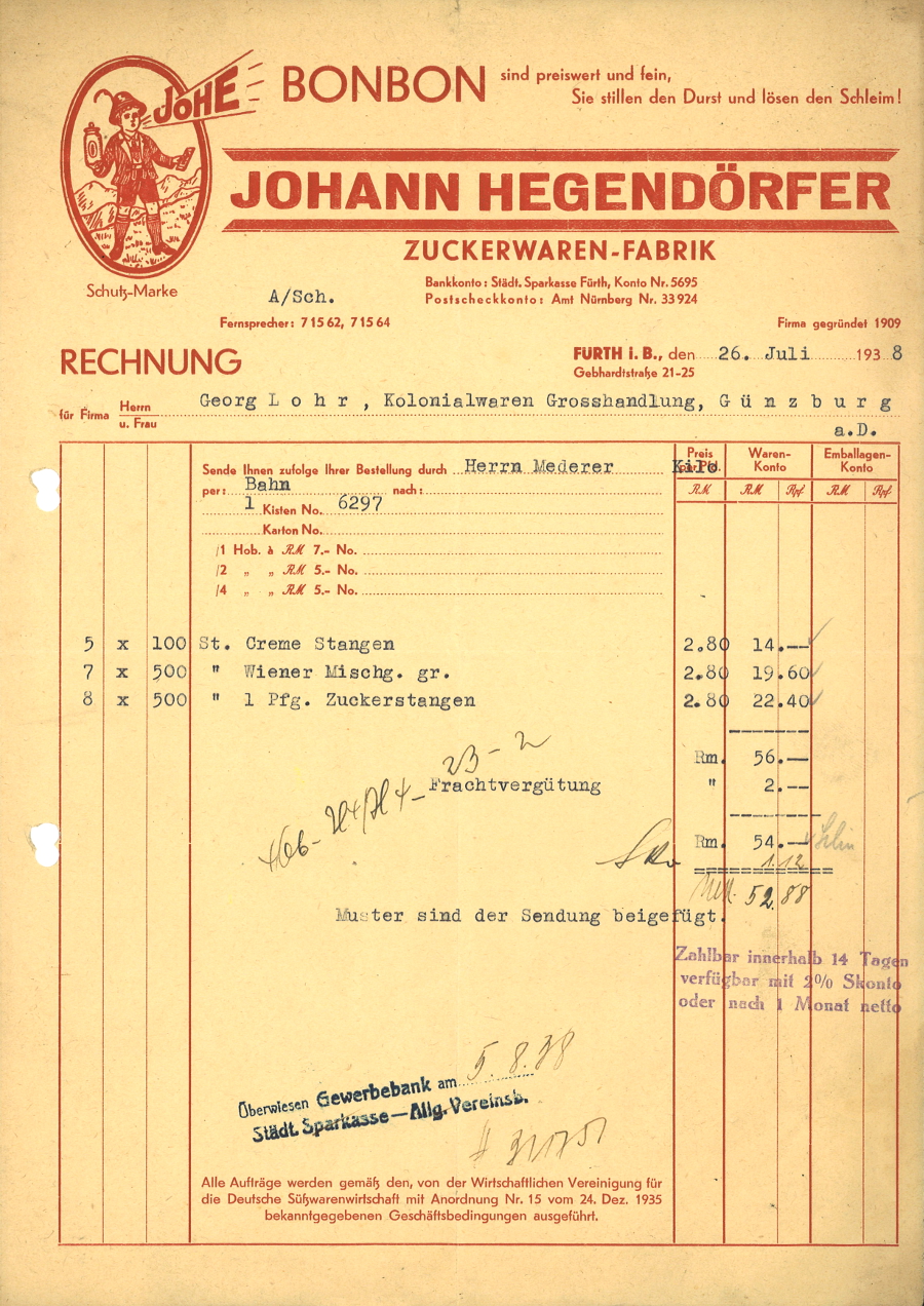 | Beschreibung | Rechnung der Fa. Johann Hegendörfer (Handelsmarke JOHE) von 1938 | ||
