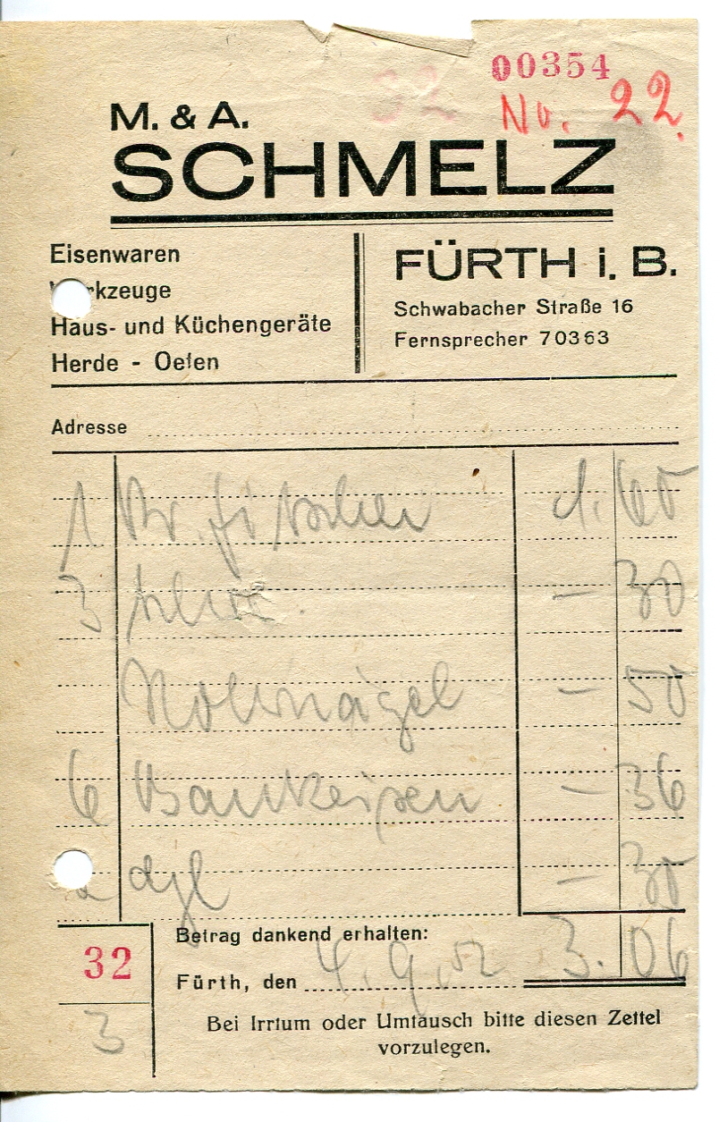 | Beschreibung | Rechnung von 1952 der Eisenwarenhandlung Schmelz in der Schwabacher Straße 16 | ||