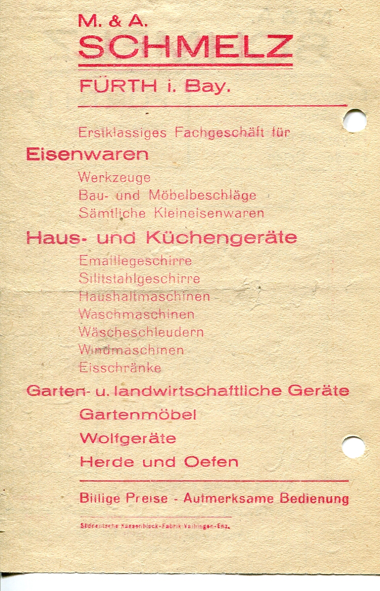 | Dateiinfo (Bild-Unterschrift und Info-Box, automatisch erstellt) | Rechnung von 1952 der Eisenwarenhandlung Schmelz in der Schwabacher Straße 16 Urheber: Schmelz<br><br>Lizenz: CC BY-SA 3.0 | ||