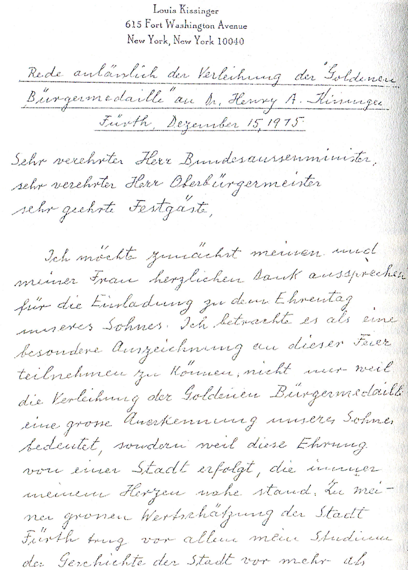 | Beschreibung | Louis Kissingers schriftlich verfasste Rede anlässlich seines Besuches in Fürth, Dezember 1975. | ||